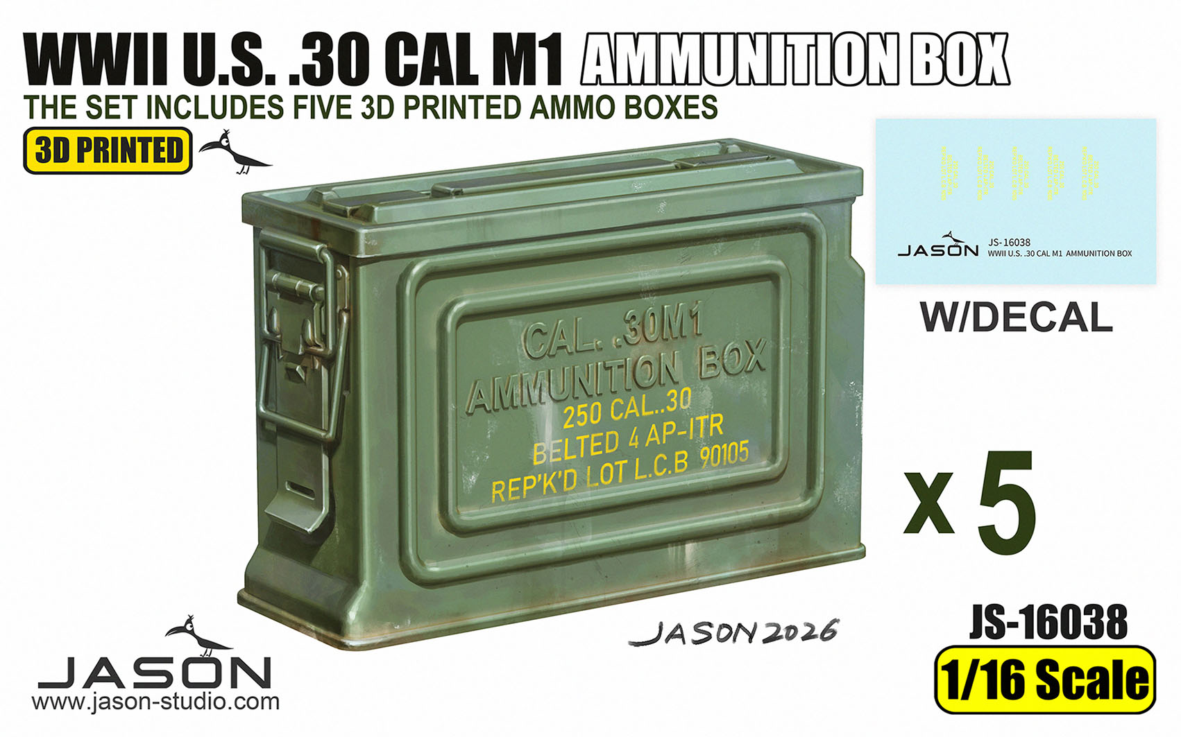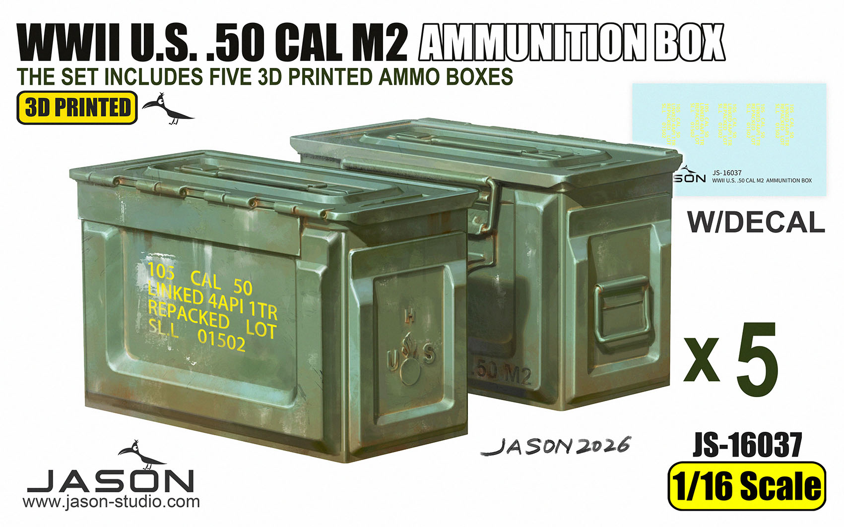The set includes 3D printed .50 cal ammunition box (2 pcs) and .30 cal ammunition box (3 pcs)